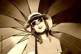 Young woman wearing summer hat, sunglasses and orange shirt showing her tongue while holding a colorful umbrella – Hipster girl feeling good and having fun outdoor