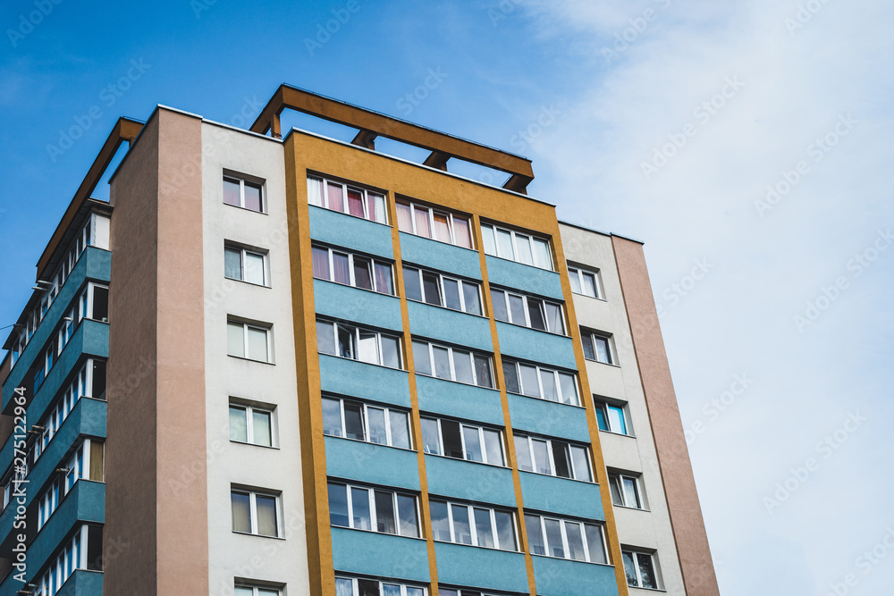 Old fashion apartment block with small windows and balconies on a bright sunny day with blue sky in background – Solid construction whit a traditional architecture