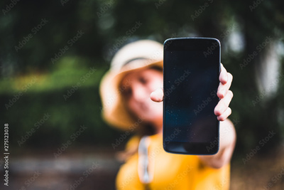 Young woman showing black mobile phone on a blurred background – Hipster girl with summer outfit holding smartphone with one hand with copy space