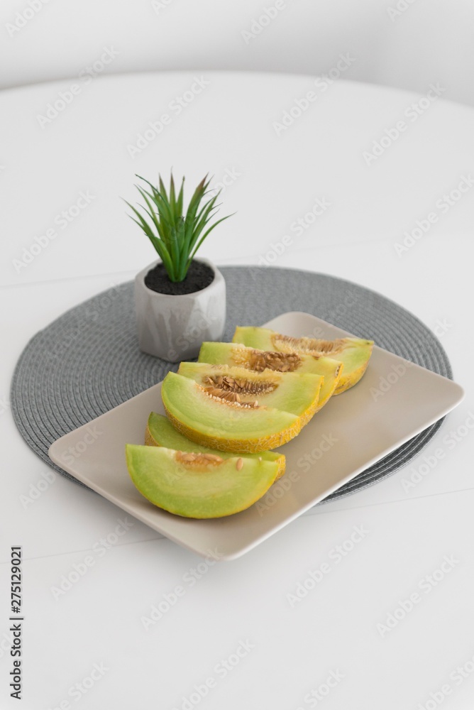 sliced melon fruit on table. melon slices on plate.