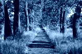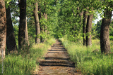 An old alley in the park with poplars (Populus suaveolens). Summer landscape with the abandoned pathway in the ancient park