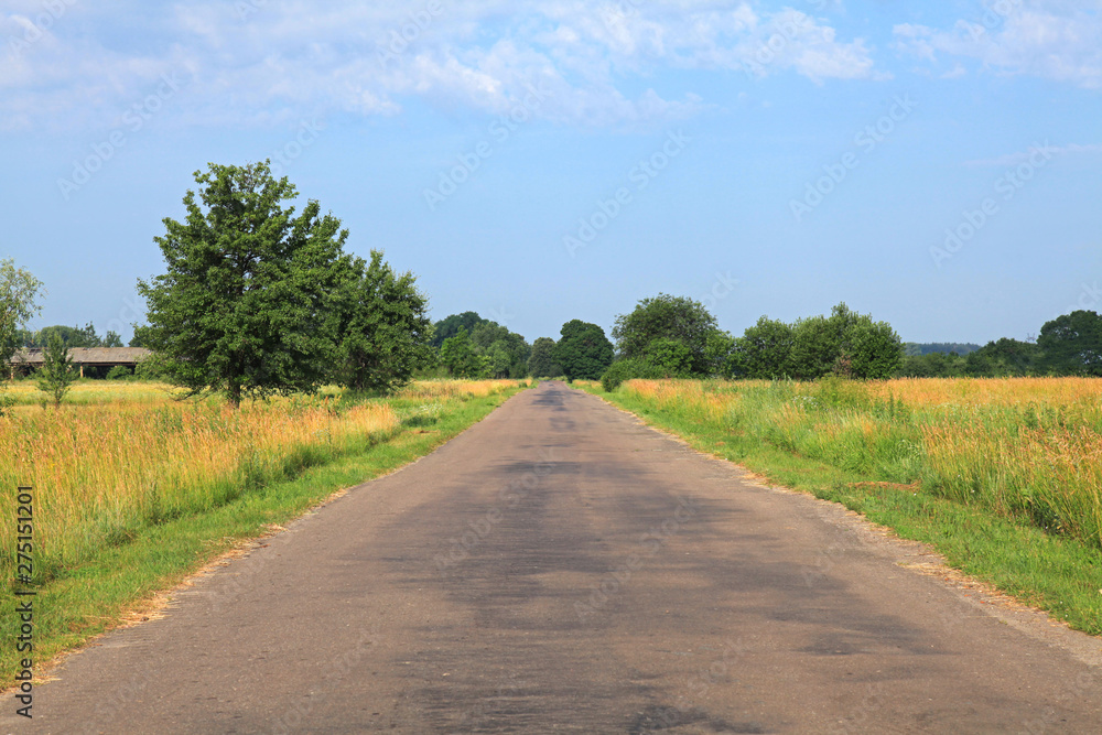 The rural or country road in the village. Summertime in the countryside. Ukrainian rural motive