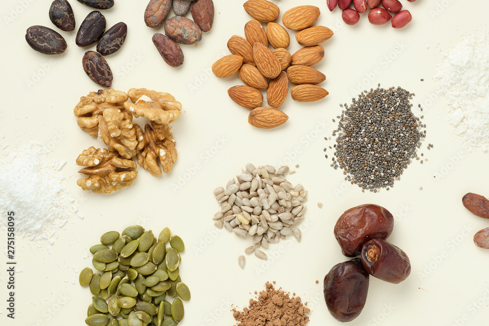 Various superfoods top view. Superfood as coconut powder, spirulina, raw cocoa bean, kerob, walnut, peanut, sunflower and pumpkin seeds.