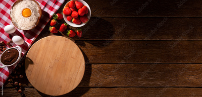Strawberry and hazelnut cream at wooden rustic background with copyspace on round pizza desk. Set of fresh fruit and hazelnut. Pizza ingredients. Brazilian sweet pizza concept, top view.