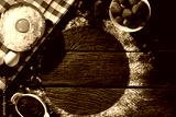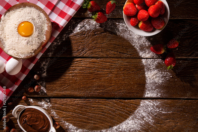 Strawberry and hazelnut cream at wooden rustic background with copyspace on round pizza desk. Set of fresh fruit and hazelnut. Pizza ingredients. Brazilian sweet pizza concept, top view.