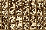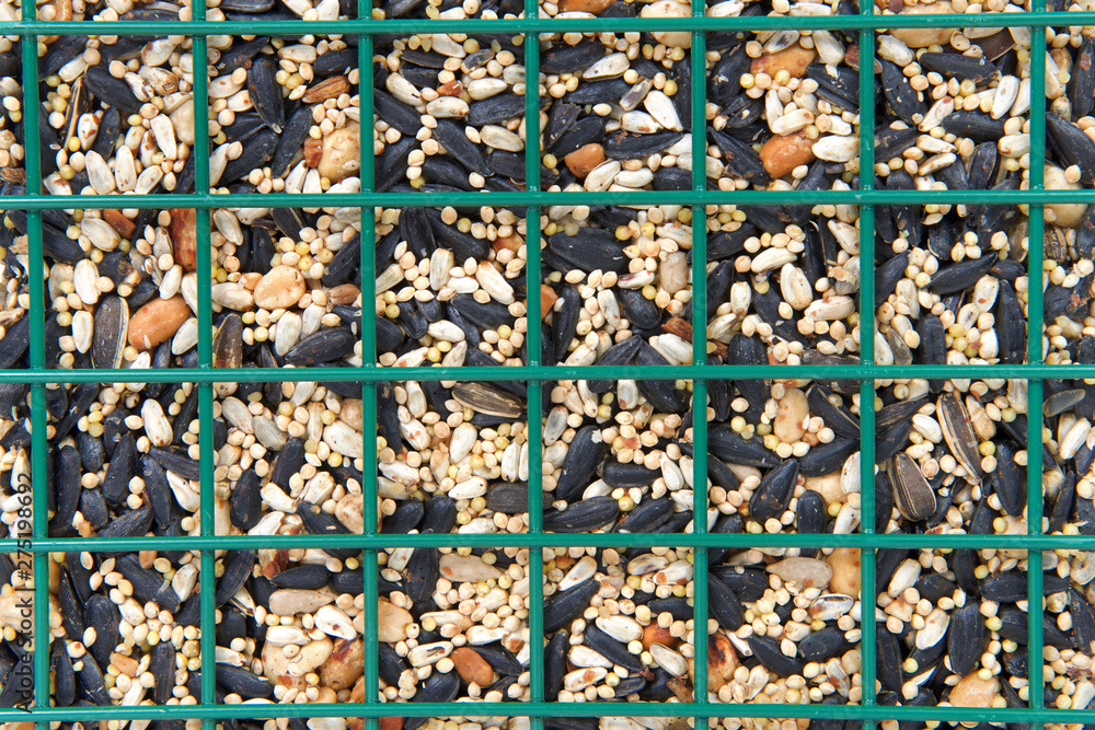 Close up on large bird seed cake for bird feeder inside wire basket. sunflowers, peanuts, safflower, millet and honey to form a sold cake of bird seed inside a green wire basket for hanging.