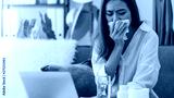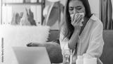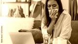 Asian beautiful woman sick with the flu while working with a laptop.Hand holding tissue paper after taking a cold medication.Concept of hard work without maintaining health.