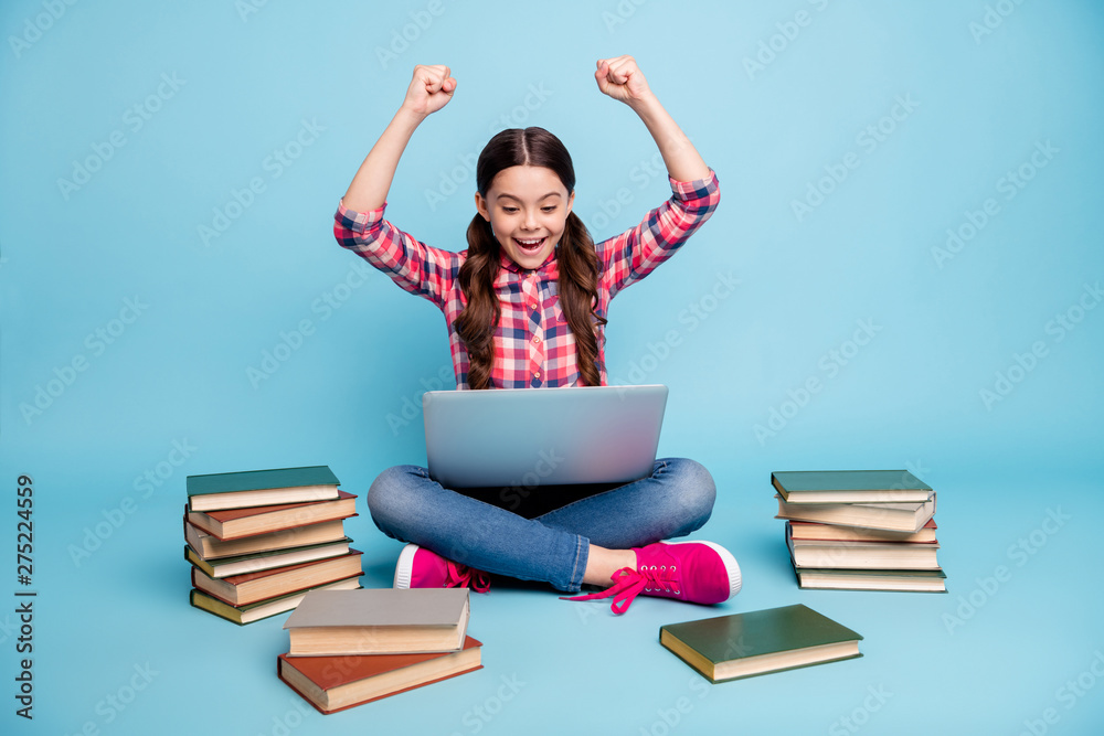 Portrait of nice attractive cheerful cheery positive smart clever girl wearing checked shirt sitting in lotus pose excellent digital web library academic isolated on bright vivid shine blue background