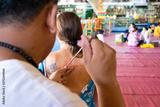 Master makes traditional Yantra tattoo on magic tattoo Sak Yant holiday. Thailand.