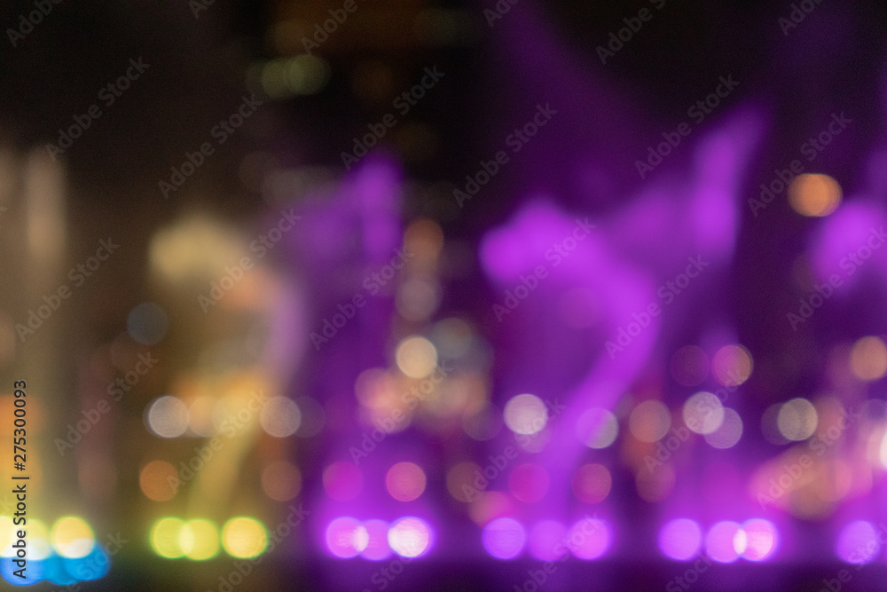 Defocused Blurred Abstract background of fountain light with colorful illuminations bokeh at night. Background Concept.