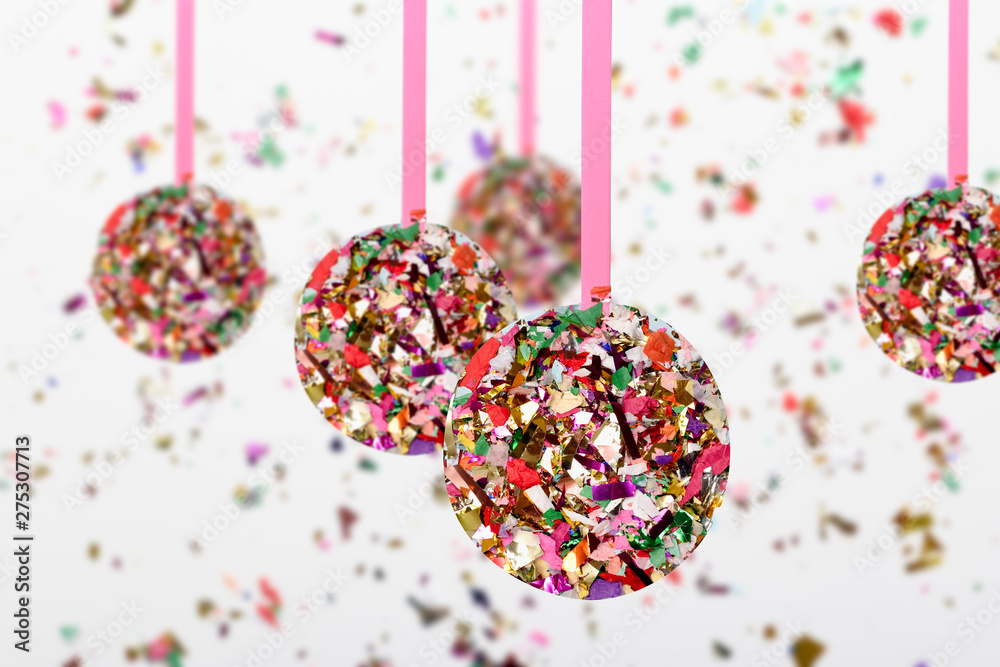 Christmas decorations, hand made, xmas baubles hanging over glitter background