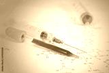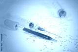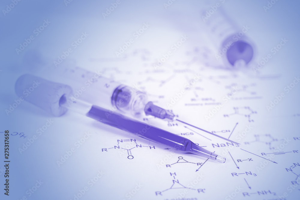 Red solution in syringe with dropper and chemical formula background , science concept.