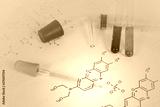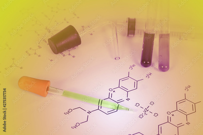 Laboratory test tube with dropper and chemical formula background , science concept.