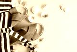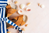 Striped beach bag with casual trendy leather sandals with crisscross details, shells on pink pastel background. Vacation holidays layout.