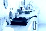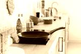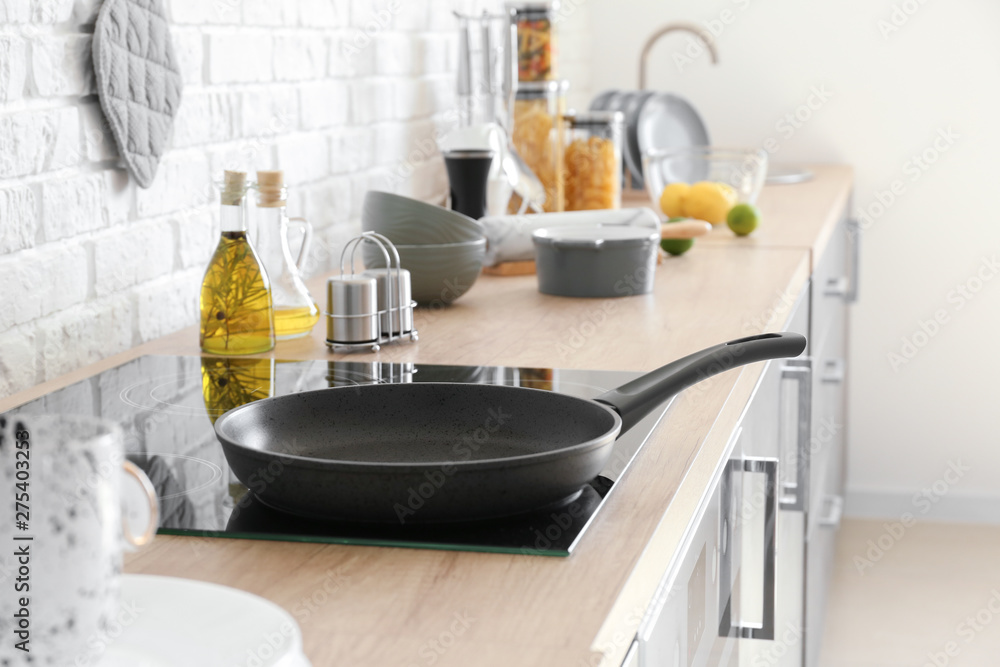 Frying pan on electric stove in kitchen