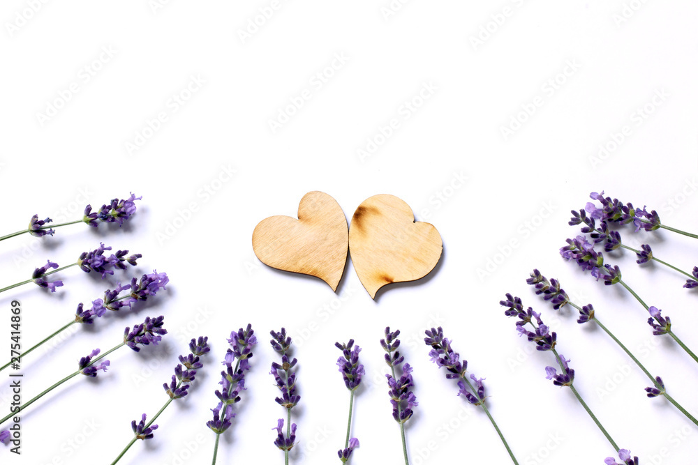 two hearts and flowers of lavender on a light background top view. romantic flavor of love