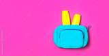 Female cosmetics bag, cosmetic products, yellow sunscreen bottle and sunblock lotion, spray on bright pink fuchsia background top view flat lay. Minimalism cosmetics style. Bright summer concept
