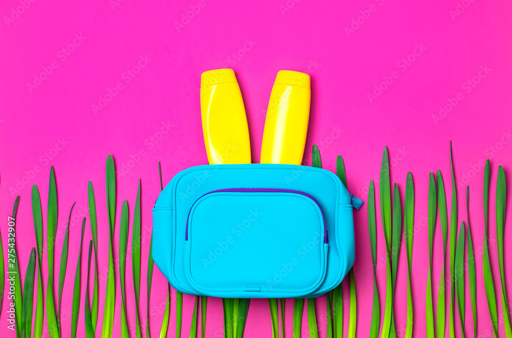 Female cosmetics bag, cosmetic products, sunscreen cream, green leaves on bright pink fuchsia background top view flat lay. Minimalism cosmetics style. Creative concept of hare or rabbit