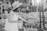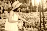 Young Woman puts fruits and vegetables in cotton produce bag at food market. Reusable eco bag for shopping. Zero waste concept.