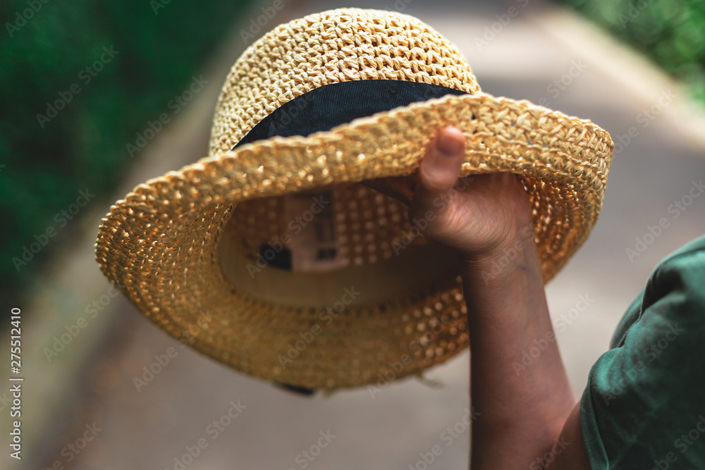 Yellow straw hat with black ribbon held by young person’s hand – Summer accessory made from natural material for protection against bright sunlight