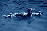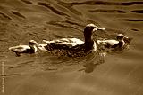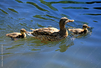 Mother-duck with two chicks ducklings on the pond