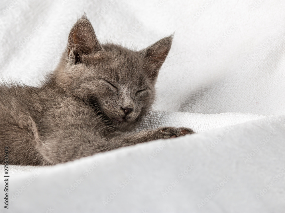 cute domestic kitten lying on white towel