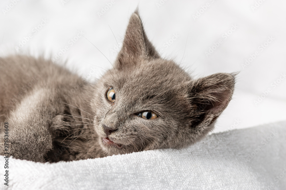 cute domestic kitten lying on white towel and looking to camera
