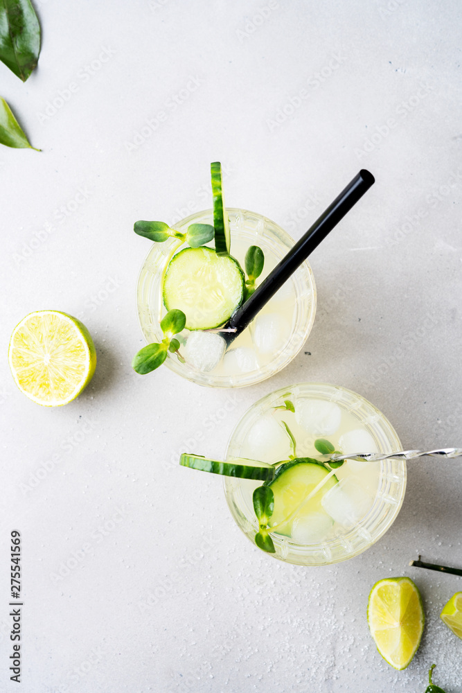 Top view of two glasses with Fresh Summer Healthy homemade mojito lemonade or cocktail with cucumber garnished with slice lime and micro greens on light background.