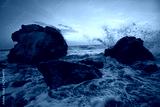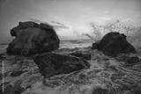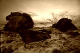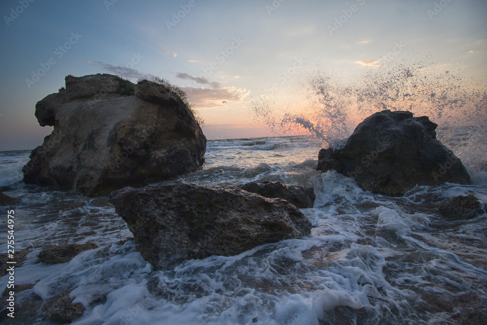 Splashing waves beat against the rocks on the beach at sunset. Crimea