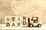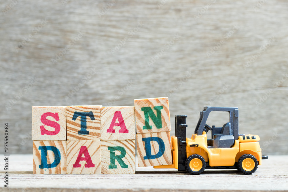 Toy forklift hold letter block n, d to complete word standard on wood background