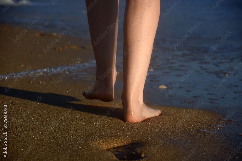 Woman legs on sandy beach. Girl walking on sand by the sea. Beach travel - Summer vacations concepts