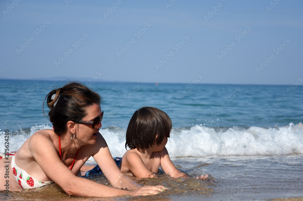 Mother and son enjoying on beach. Happy family relax on sea on summer vacation