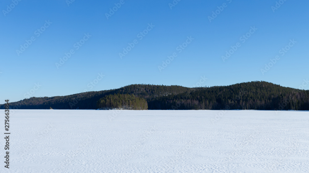 Winter landscape with lake and ice. National park Isojarvi in Finland