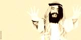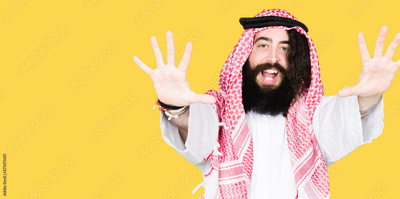 Arabian business man with long hair wearing traditional keffiyeh scarf showing and pointing up with fingers number ten while smiling confident and happy.