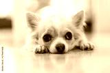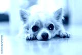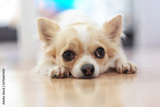 Small Chihuahua dog with a white and beige color on the floor. Lonely dog.