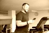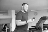 chubby man walking on running track, warming up on gym treadmill. man with phone