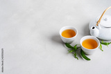 Tea concept with white tea set of cups and teapot surrounded with fresh tea leaves on concrete background with copy space.