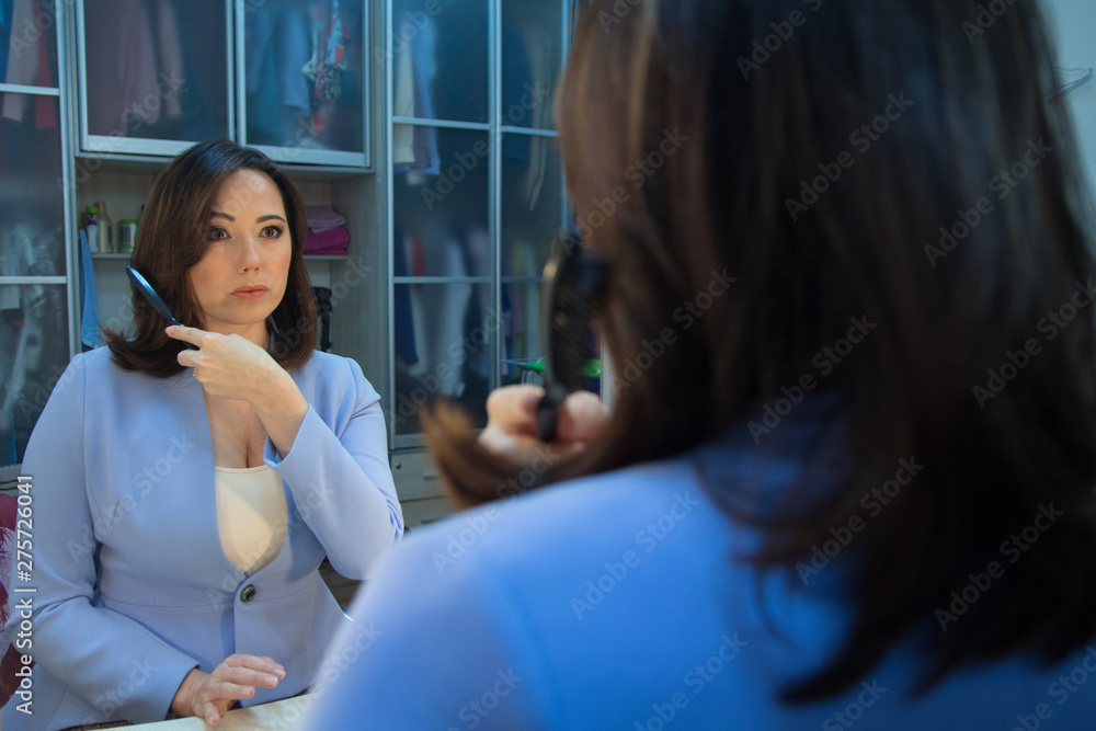 Woman in front of a mirror in the dressing room. People