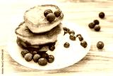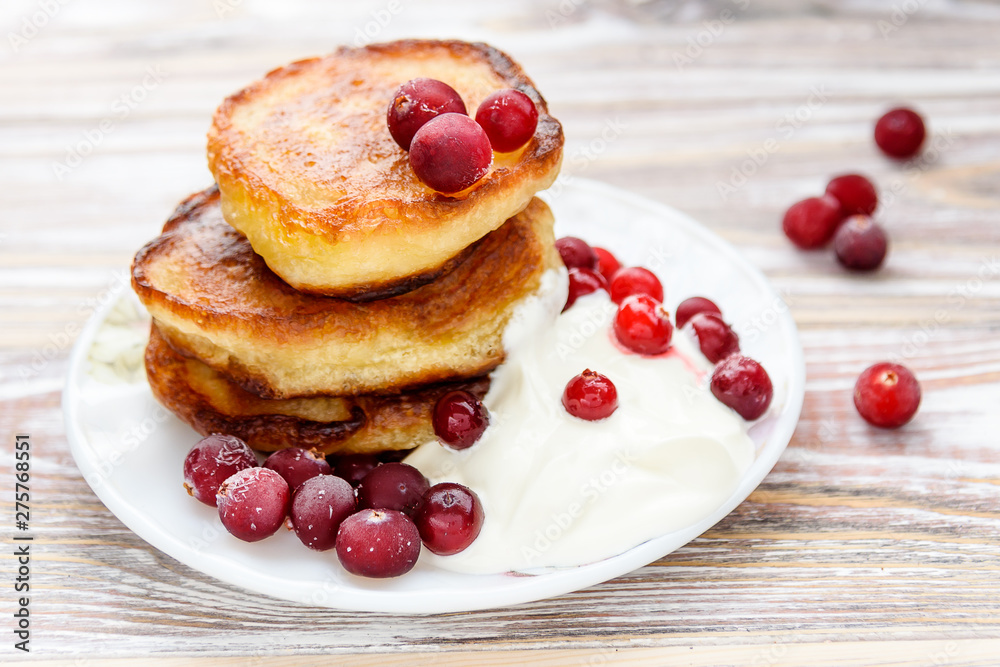 Pancakes with berries and sour cream on a plate. Summer cottage of Russian delicacies