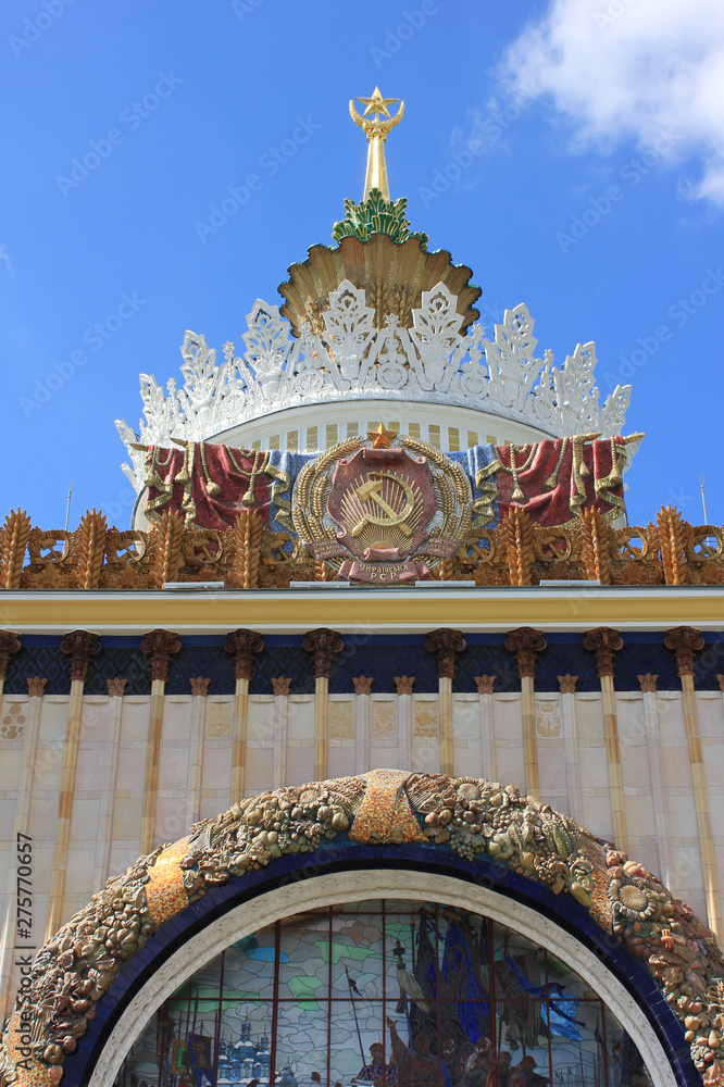 Hammer and sickle Soviet symbol of Ukrainian SSR (Soviet Ukraine) on ornamental house facade