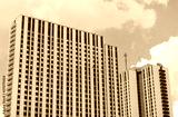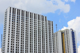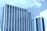 White high building facade on blue sky background. Multi story real estate house front architecture in Moscow, Russia