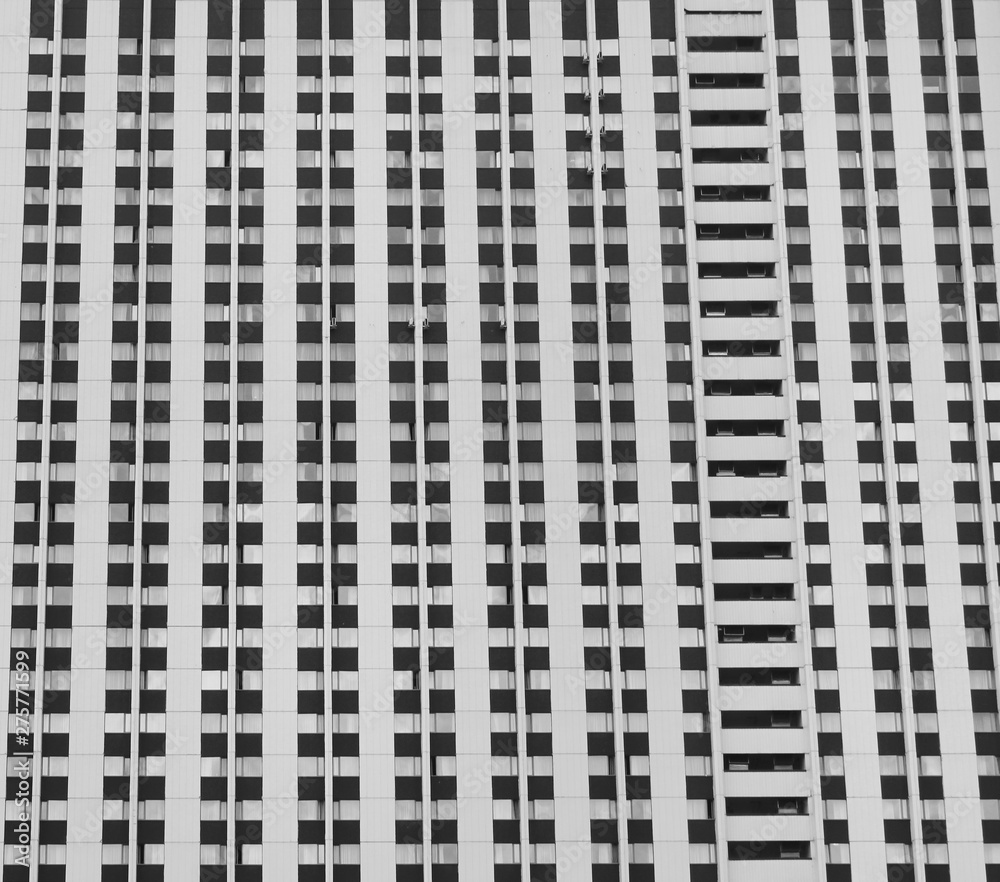 Old building facade black and white view. House front with windows in row, simple architecture close up