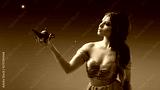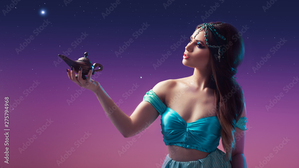 Oriental fairy tale, a young Princess woman with a magic lamp in her hands.
