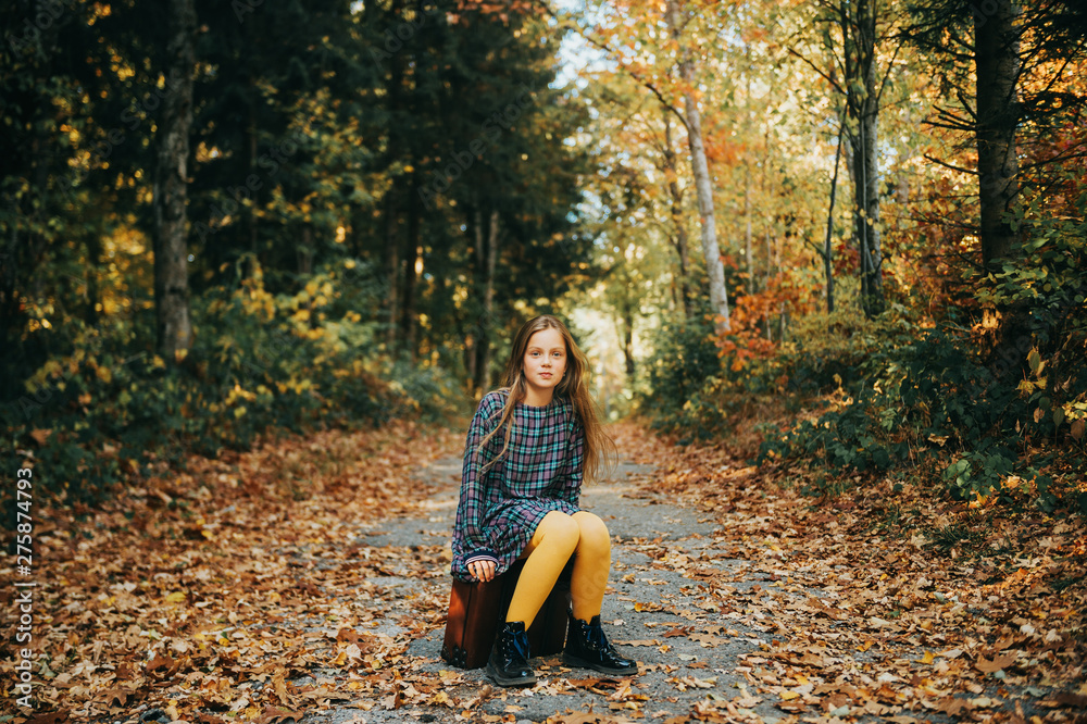 Autumn portrait of pretty young girl with old vintage suitcase, kid model posing outdoor in the forest, wearing plaid dress and yellow tights
