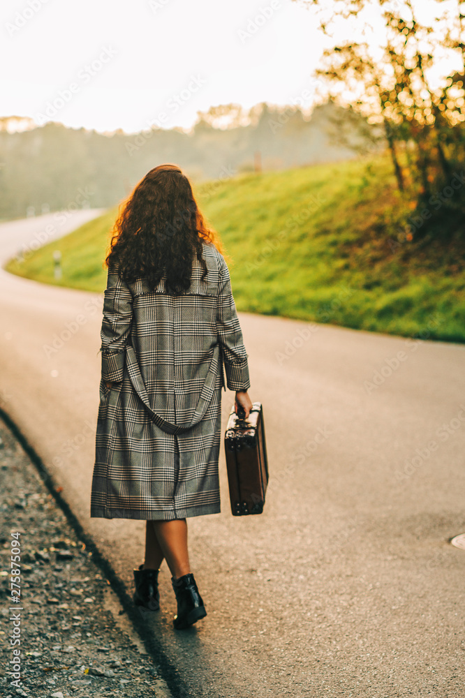 Beautiful woman walking away down the road, wearing long coat, holding old vintage suitcase, back view