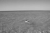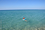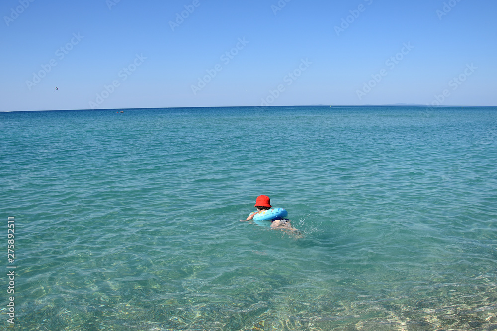 Little boy with inflatable ring swimming in the sea. Child with a floating ring enjoy in water