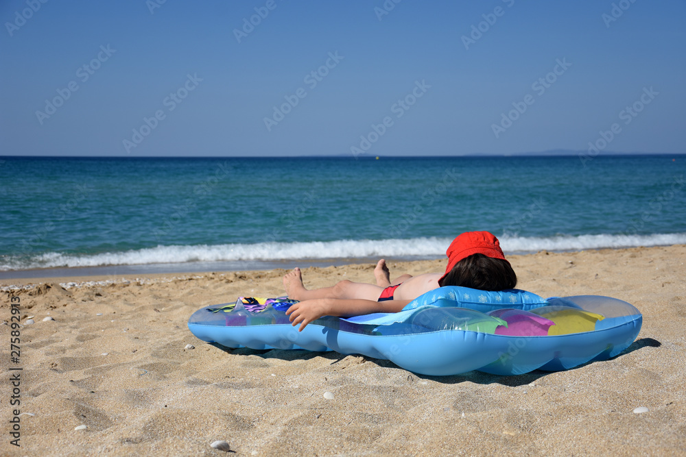 Child relax on inflatable mattress at beach. Child with a red hat lies on beach
