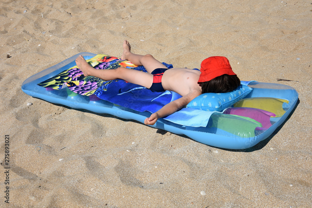 Child relax on inflatable mattress at beach. Child with a red hat lies on beach