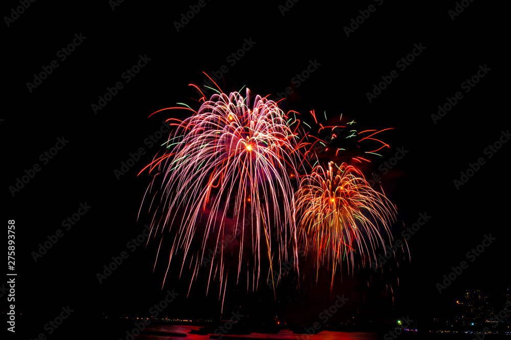Beautiful colorful fireworks display on the sea beach, Amazing holiday fireworks party or any celebration event in the dark sky.