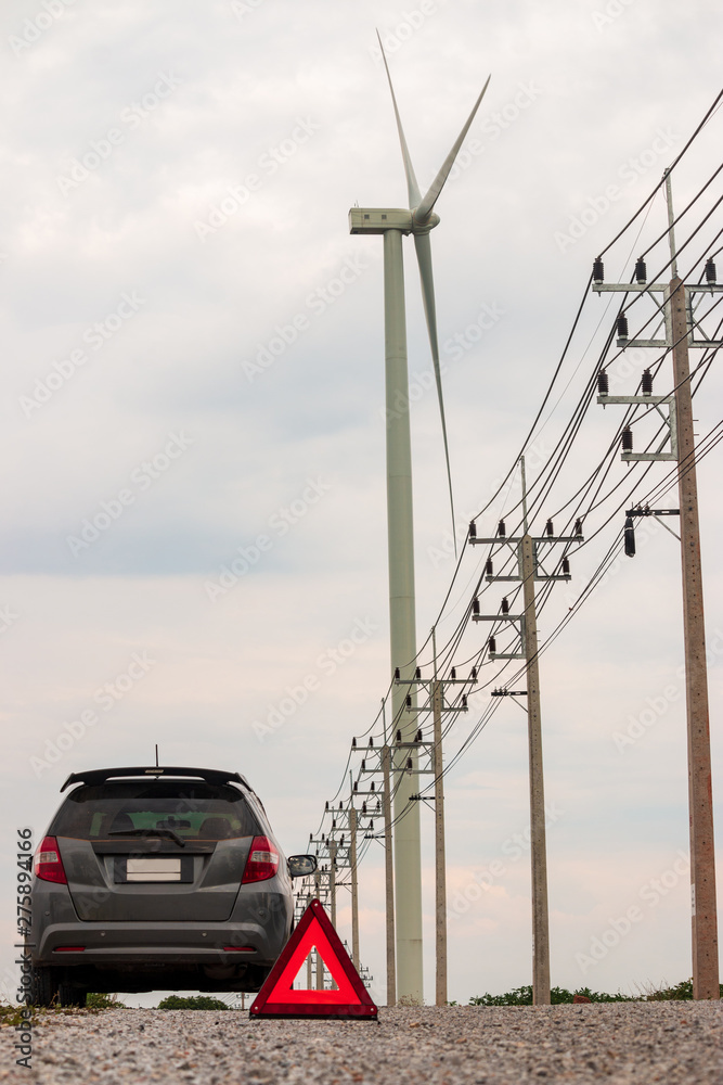Red warning triangle. Focus on red triangle!, beside rural road.